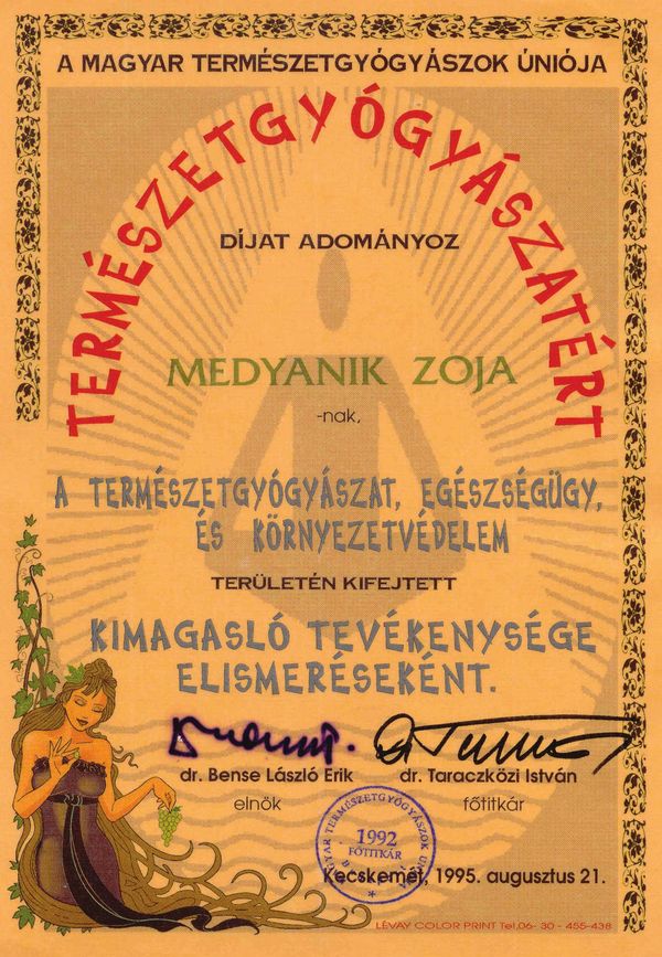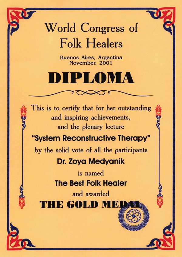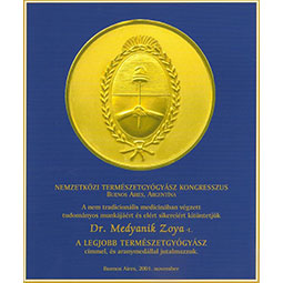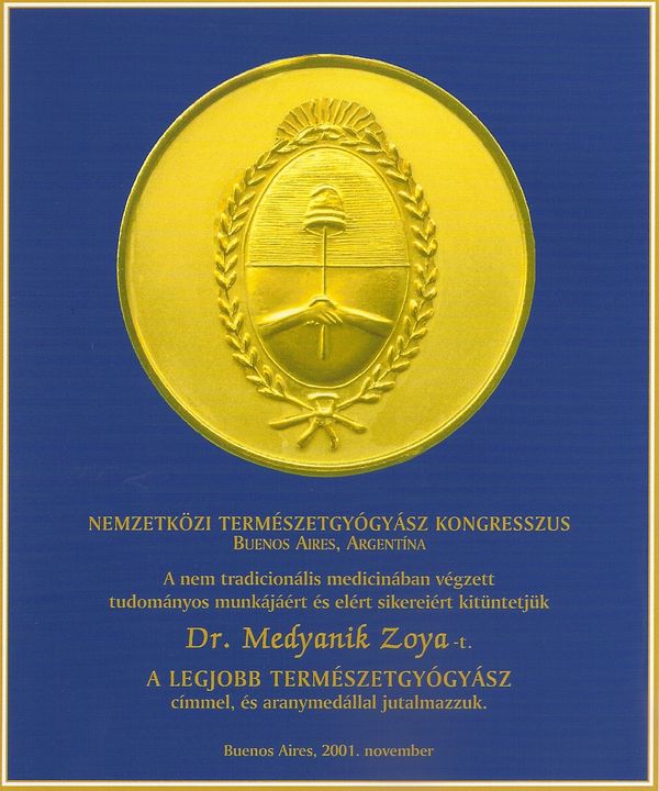 2001 novemberében Buenos Aires (Argentína) Nemzetközi Természetgyógyász Kongresszuson a Legjobb Természetgyógyász címmel és aranymedállal jutalmazták.