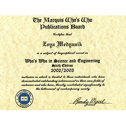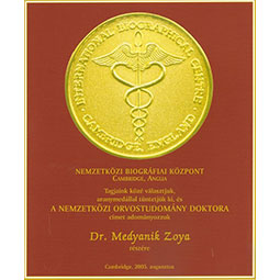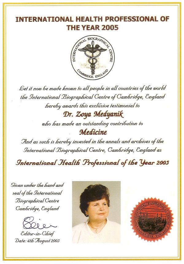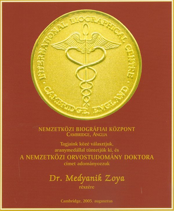 2005 augusztusában Cambridge-ben (Anglia) a Nemzetközi Biográfiai Központ tagjai közé választották aranymedállal jutalmazták, majd a Nemzetközi Orvostudomány Doktora címmel tüntették ki és ugyanebben az évben megválasztották az Év Nemzetközi Egészségügyi Szakemberévé is.