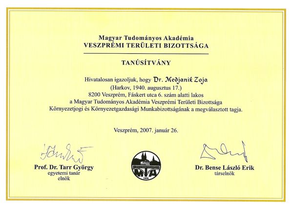 2007 januárjában a Magyar Tudományos Akadémia Környezetjogi és Környezetgazdasági Munkabizottsága tagjai közé választották.