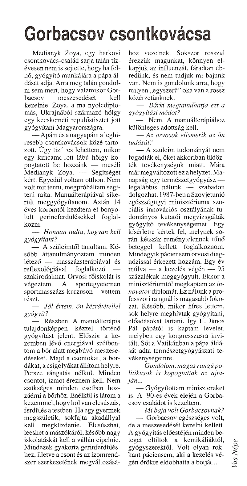 A rendszerváltás fenegyerekének nevezett Gorbacsov házaspár is Zoya asszony páciensei közé tartozott, ami hírét és ellenségeinek táborát is növelte. A régi kommunista nomenklatúra emberei ugyanis az akkori Szovjetunióban nem nézték jó szemmel Gorbacsov nyitását a Nyugat felé, Amerikához és a demokrácia megteremtése érdekében tett lépéseit.