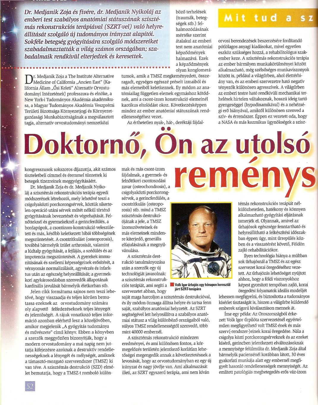 A NASA és más kozmikus ügynökségek ezt a terápiát nélkülözhetetlen és hatékony gyógyítási eljárásnak ismerték el. A NASA közvetítésével több asztronautát kezelt, a kezelések során az űrhajózás következtében elszenvedett rendellenességeket és fájdalmakat megszüntetve.